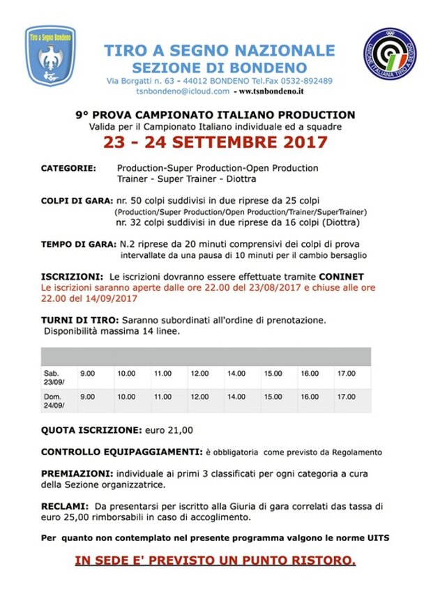 © 2021 Tiro a Segno Nazionale - Sezione di Bondeno - Via Borgatti, 63 - 44012 Bondeno (FE) - Partita IVA: IT01784960385 - Cod. Fisc. 80011670389