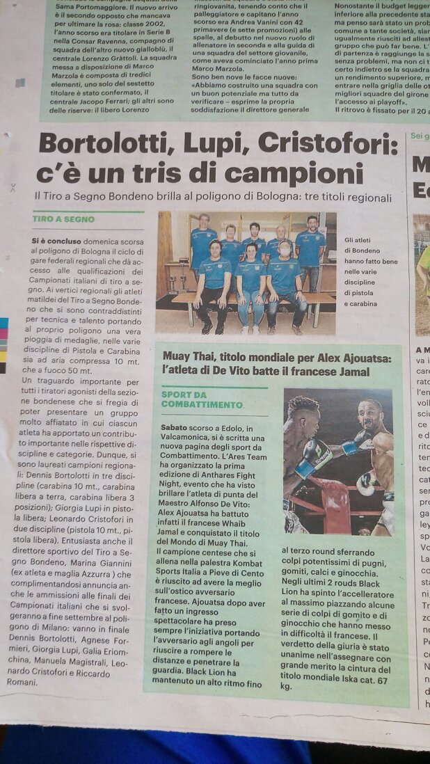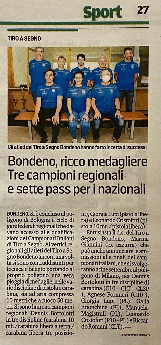 Un traguardo importante per tutti i tiratori agonisti della sezione bondenese che si fregia di poter presentare un gruppo molto affiatato in cui ciascun atleta ha apportato un contributo importante nelle rispettive discipline e categorie. Dunque, si sono laureati campioni regionali: Dennis Bortolotti in tre discipline (carabina 10 mt., carabina libera a terra, carabina libera 3 posizioni); Giorgia Lupi in pistola libera; Leonardo Cristofori in due discipline (pistola 10 mt., pistola libera). Entusiasta anche il direttore sportivo del Tiro a Segno Bondeno, Marina Giannini (ex atleta e maglia Azzurra ) che complimentandosi annuncia anche le ammissioni alle finali dei Campionati italiani che si svolgeranno a fine settembre al poligono di Milano: vanno in finale Dennis Bortolotti, Agnese Formieri, Giorgia Lupi, Galia Eriomchina, Manuela Magistrali, Leonardo Cristofori e Riccardo Romani.