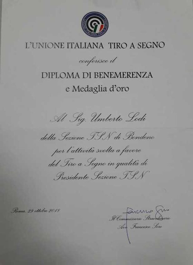 Il nostro Presidente Ing. Umberto Lodi è stato insignito dalla UITS del diploma di benemerenza e medaglia d'oro per l'attività svolta a favore del tiro a segno in qualità di presidente.